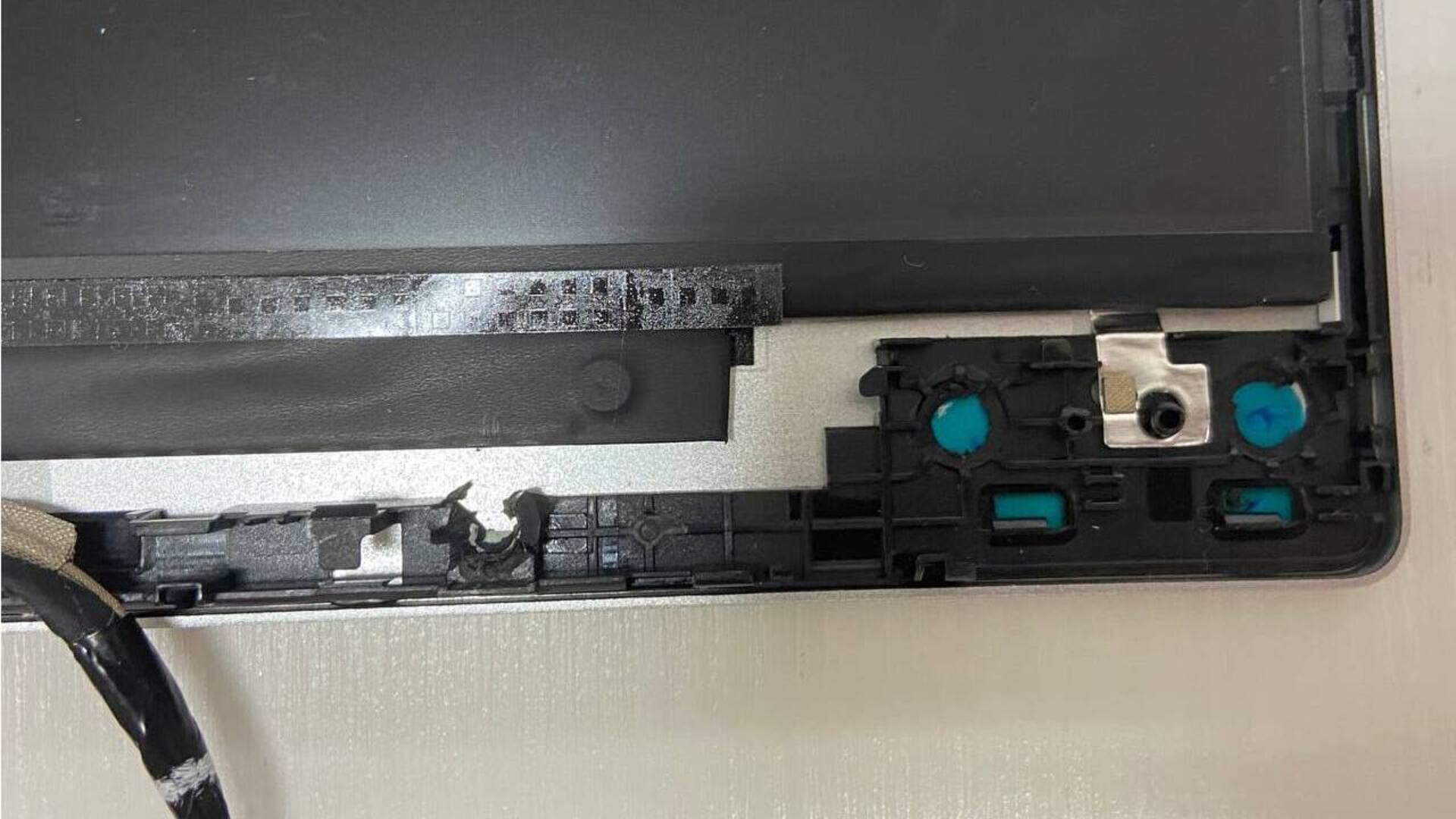 Чаще всего страдают места крепления петель. Если при открытии крышки угол корпуса расходится, слышен хруст, или верхняя панель (топкейс) приподнимается вместе с экраном — значит, разрушены внутренние крепежные стойки. Также ремонт необходим при появлении трещин на нижней крышке (поддоне), сколах углов после падения или выпадании винтов. Если винт выпадает сам по себе, это означает, что внутри корпуса отломилась латунная втулка, в которую он вкручивался. Игнорирование таких поломок приводит к тому, что сломанные части корпуса начинают передавливать проложенные рядом кабели (шлейф матрицы, антенны Wi-Fi). Кроме того, из-за потери жесткости крышка матрицы открывается с перекосом, и при очередном открытии матрица может треснуть от неравномерной нагрузки.